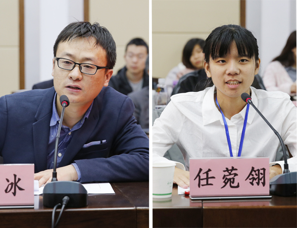 我校学生代表吴冰和台湾学生代表任菀翎在论坛开幕式上发言